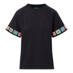 5.3oz 60/37/3 cotton/polyester/spandex jersey. Super soft sueded finish. Crochet detail at sleeve cuffs. Clean finish hem. Rib knit collar. Boxy fit.