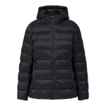 100% nylon shell. 100% polyester lining. Polyester fill with 550 - 650 fill power. Horizontal quilting design. Exposed matching plastic zippers at center front and pockets. Elastic cuffs. Fixed hood. Water-repellent. Classic fit.