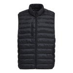 100% nylon shell. 100% polyester lining. Polyester fill with 540 - 570 fill power. Horizontal quilting design. Exposed nylon coil zipper at center front.Right chest and side zipper pockets. Binding at armholes, hem, and pockets. Water resistant. Classic fit.